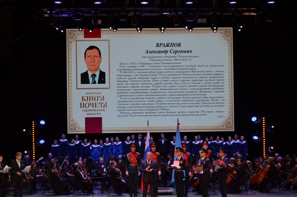 Конечно, не авиацией единой славен ульяновский край. Достойно несут службу воины в зоне СВО, минутой молчания почтили память погибших, с честью выполнивших свой долг. Свой вклад в развитие и успехи Ульяновской области внесли труженики многих отраслей, за что в 2025 году 60 человек были удостоены государственных наград. Кстати, в апреле наступившего года грядет еще одна дата: 60 лет назад Ульяновская область за достигнутые успехи в развитии была награждена высшей государственной наградой - Орденом Ленина. Когда на сцену поднялся Губернатор Алексей Русских, началась непосредственно официальная часть празднования. И началась она с Гимна Ульяновской области. Выступал Алексей Юрьевич чуть более шести минут, за которые успел назвать все значимые события года минувшего. Это и высокие производственные показатели, и рекордный за последние сорок лет урожай зерновых, и темпы роста инвестиций. В частности, произошло замещение всех 19 иностранных компаний, ушедших из региона в течение нескольких лет. Поблагодарил участников Специальной военной операции, членов их семей, военных и представителей силовых структур за службу. После выступления Губернатора началась церемония вручения высшей награды региона - звания Почетного гражданина Ульяновской области. В отличие от прошлых лет, такого звания удостоены сразу трое наших земляков. Это Александр Сергеевич Вражнов, длительное время возглавлявший Новоспасский район и внесший значительный вклад в его развитие. Это Ряхим Ибрагимович Камаев, Глава Вешкаймского района, чья деятельность на протяжении 40 лет связана с сельским хозяйством. Это Александр Александрович Майер, создавший уникальное предприятие, участвовавшее практически во всех российских и международных газовых проектах, имеющее блестящий послужной список, на чьем счету десять отраслевых рекордов. Александр Майер успел поработать и в качестве первого Председателя Правительства Ульяновской области, и первого заместителя Председателя Законодательного Собрания Ульяновской области.