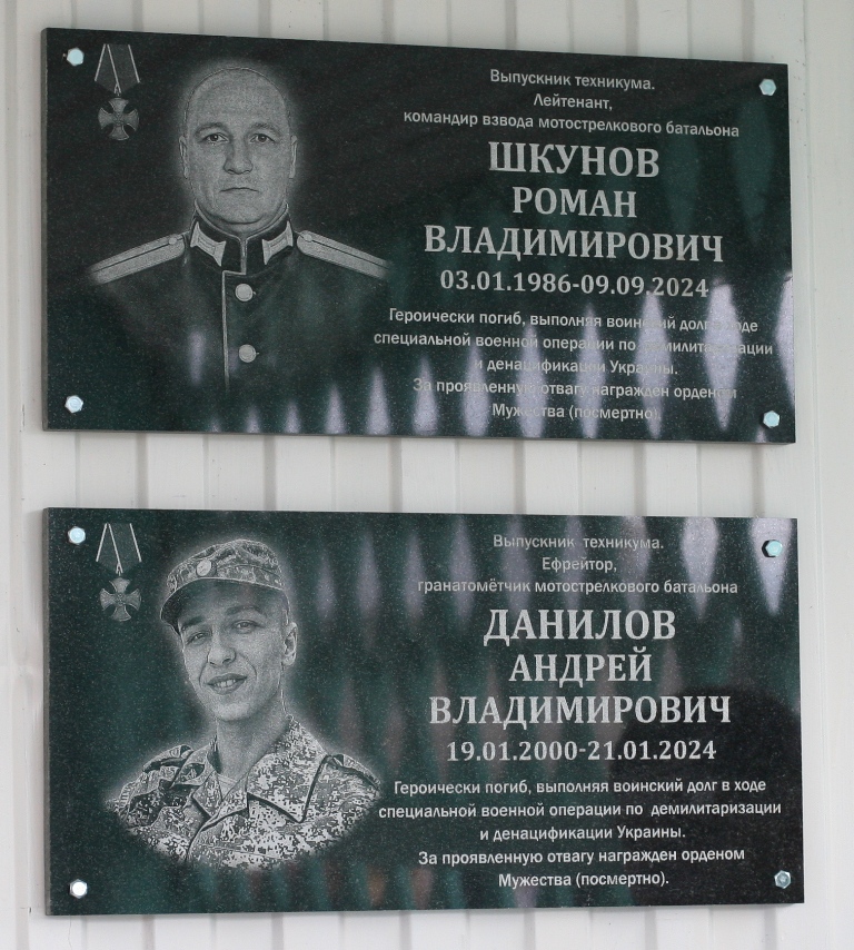Сергей Ермаков, как инициатор памятника воинам в Юлово, решил осмотреть его, поскольку было обращение одного из местных жителей с просьбой обновить надписи. Староста села Татьяна Саранцева встречала Ермакова возле обновленного памятника, надписи на котором получились яркими, к тому же список погибших пополнился несколькими фамилиями, которые удалось установить в последние два года. Затем была Инза, техникум отраслевых технологий, экономики и права, где прошел митинг и открыты памятные доски двум участникам СВО - Роману Шкунову и Андрею Данилову. Оба посмертно награждены орденом Мужества. На митинге, который сопровождало торжественное построение студентов, держащих портреты выпускников, погибших в зоне СВО, выступили глава Инзенского района Андрей Волгин, Глава администрации Александр Кузнецов, директор техникума Наталья Ёлчева, мастер производства ООО "Изол БРИКС" Александр Самошин, председатель районного совета ветеранов Галина Кирилина. Слово также брали отец погибшего лейтенанта Романа Шкунова Владимир Николаевич и жена Романа Анна, мать погибшего Андрея Данилова Снежана. Выступления были короткими, в основном сдержанными, но очень выразительными. Минутой молчания почтили всех, кто отдал свою жизнь в интересах Отечества. Когда с досок был снят укрывной материал, а право открыть их предоставили сыну Романа и сестре Андрея, к постаменту понесли цветы. Проникновенное исполнение патриотической песни в исполнении Елены Кононовой завершило митинг.