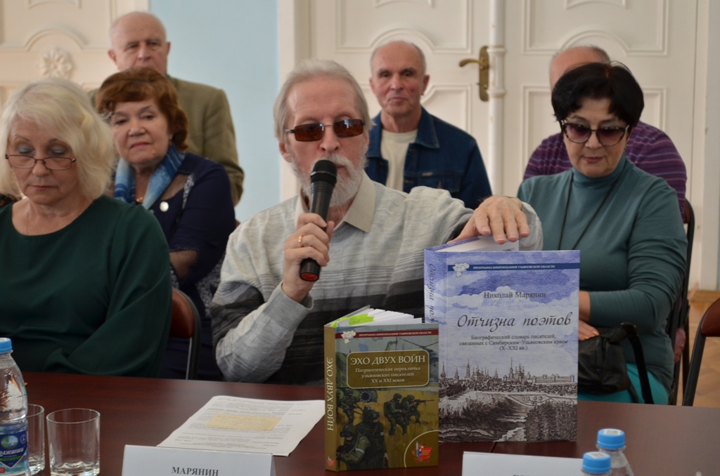 В его рамках был проведен Круглый стол "Есть ли возраст у патриотизма?" Диалог проходил в "Голубом зале" Дворца, где, кроме местных литераторов, членов Ульяновского регионального отделения Союза писателей России, выступала секретарь Союза писателей России Нина Дьякова, Министр искусства и культурной политики региона Евгения Сидорова, по видеосвязи слово брали представители писательских организаций Мордовии, Татарстана и Чувашии. Модератор - председатель правления Ульяновского отделения Союза писателей России, Заслуженный работник культуры Ульяновской области Ольга Даранова. Поскольку все присутствующие - люди увлеченные и хорошо знающие современный литературный процесс, имеющие, как минимум, книгу прозы или поэтический сборник, разговор вышел за рамки обозначенной темы, хотя она, безусловно, являлась доминантной. Что есть патриотизм? Надо ли часто употреблять это слово? В каких формах реализуется и в каких случаях доказывается, что ты патриот? Наряду с темой Великой Отечественной осмысливалась проблематика СВО, роль и участие творческой, в данном случае писательской, части общества в поддержании морального духа воюющей молодежи. Оказалось, что на линии боевого соприкосновения востребованы не только материальные предметы, но и то, что называется духовной подпиткой. Например книги, стихотворные сборники, детские рисунки. И многие из присутствующих принимали участие в доставке на фронт и "гуманитарки", и литературы. Здесь же демонстрировались экземпляры недавно вышедших книг, как по линии областной программы книгоиздания, так и изданных частным образом. Так Николай Марянин представил сборник "Эхо двух войн", а также антологию "Отчизна поэтов". Литераторы высказали ряд соображений относительно заявленной темы. Прозвучал несколько парадоксальный, но достаточно устоявшийся нарратив о том, что еще не создано по-настоящему эпического произведения о Великой Отечественной войне. Такого, которое бы соответствовало масштабу мировой драмы. И - объяснение: большое видится на расстоянии, а переживания, связанные с ней, еще будоражат умы поколений, еще не всё осмыслено и раскрыто.